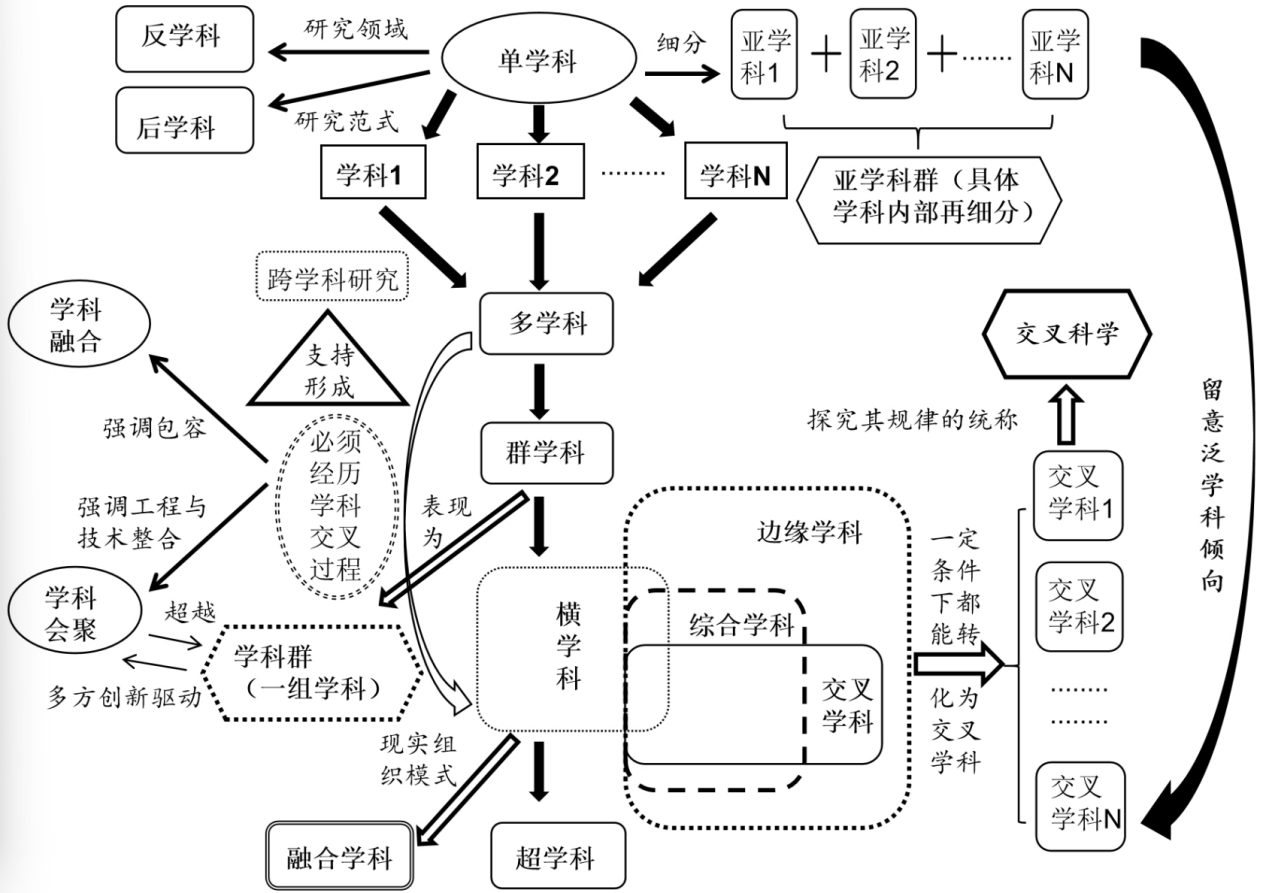 研究发现,与交叉学科相关的一些概念分别成为了交叉学科的前期铺垫、探索形态或学科延伸,研究团队据此描绘出了交叉学科与相关概念的关联谱系。